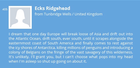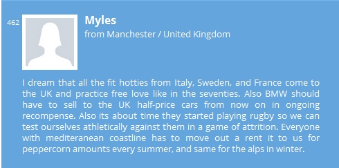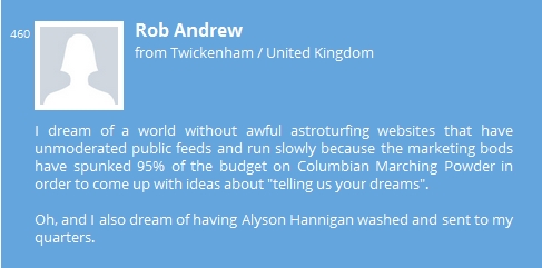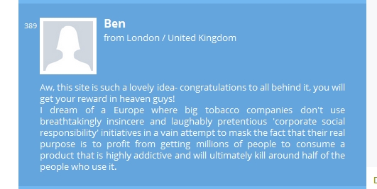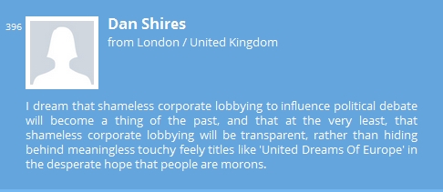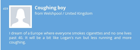 Except… The Foundation for Free Studies is an initiative of British American Tobacco, those purveyors of cancer causing cigarettes. And more importantly, see that bit about “posting a personal dream for Europe”? Well, they forgot one crucial thing – to moderate the entries.